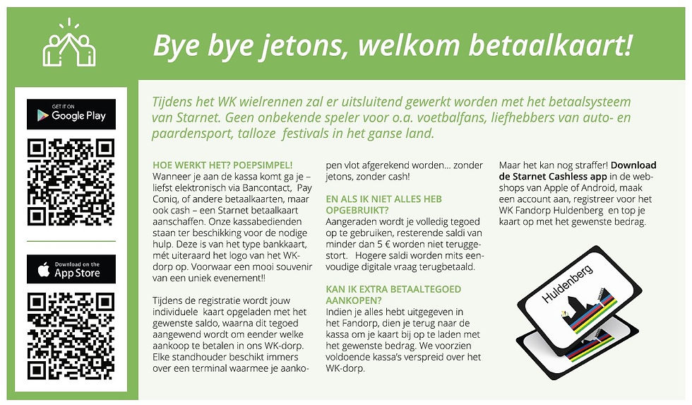 Lees hieronder hoe het betaalsysteem werkt in het WK-dorp. Met de betaalkaart kan je bij alle standhouders betalen gedurende het volledige WK-weekend (op de braderie, aan de togen, in de tenten, in de sporthal, enz.). Veilig en makkelijk voor iedereen. Zit je nog met vragen? Onze kassabedienden kunnen je zeker helpen.